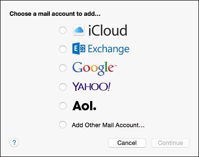 3. En la lista "Choose a mail account to add..." (Elige una cuenta de correo para agregar…), elige "Add Other Mail Account" (Agregar otra cuenta de mail…) y haz clic en "Continue" (Continuar).