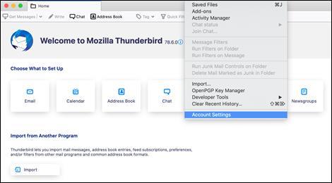 1. Ve al menú "Tools" (Herramientas) y haz clic en "Account Settings" (Configuración de la cuenta), o haz clic con el botón derecho en tu dirección de email y selecciona "Settings" (Configuración).