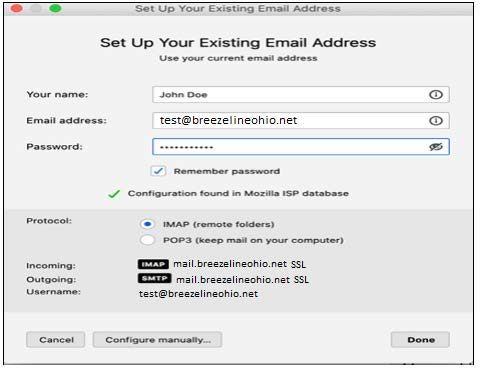 5. ¡Haz clic en "Done" (Listo) y estarás listo! Ahora puedes acceder a tu cuenta de breezelineohio.net con Thunderbird. Configurar manualmente los ajustes del servidor entrante (IMAP) y saliente (SMTP) para Thunderbird