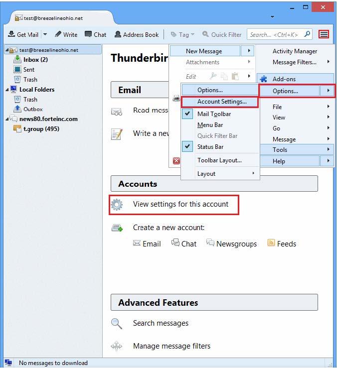 menú y haz clic en "Options" (Opciones) > "Account Settings" (Configuración de la cuenta), o haz clic en tu cuenta de @breezelineohio.net y luego selecciona "View settings for this account" (Ver configuración para esta cuenta).